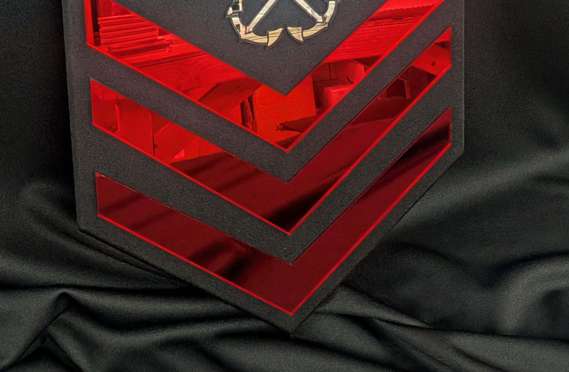 They are made with Hardwood and Black Fabric with Silver, Red, and/or Yellow mirrored acrylic.